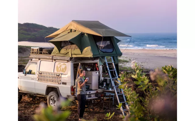 Rooftop tent Gordigear Tanami Base pour 2 personnes, toile durable respirante, échelle télescopique et design robuste adapté à toutes aventures outdoor.